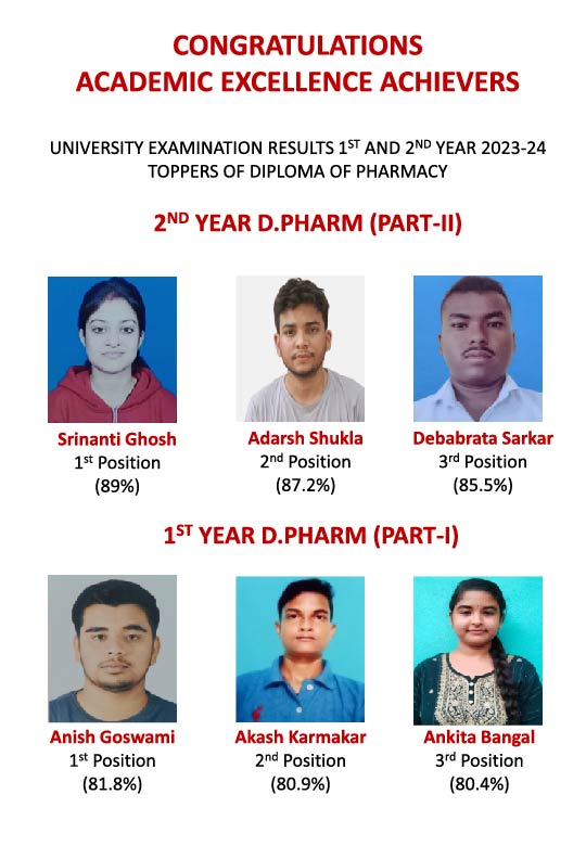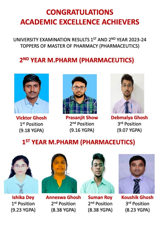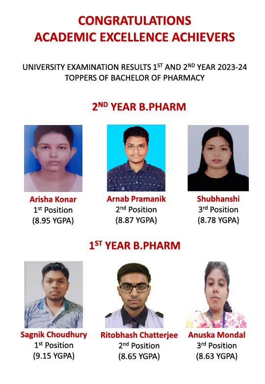 TOPPERS OF BACHELOR OF PHARMACY CONGRATULATIONS ACADEMIC EXCELLENCE ACHIEVERS UNIVERSITY EXAMINATION RESULTS 2nd, 4th, 6th & 8th SEMESTER 2019TOPPERS OF BACHELOR OF PHARMACY 2nd Semester Nabanita Pramanik (SGPA-9.77) Dipanwita Pramanik (SGPA-9.63) Suravi Saha (SGPA-9.23) 4th Semester Bishal Rahman Reja (SGPA-9.43) Bikram Aditya (SGPA-9.14) Atrayee Mukherjee (SGPA-9.07) 6th Semester Sushmita Pal (SGPA-9.39) Arijit Mondal (SGPA-9.27) Payel Mal (SGPA-9.27) 8th Semester ANSHU GUPTA (SGPA-9.60) NISHA KISKU (SGPA-9.30) Mouli Mukherjee (SGPA-9.25)